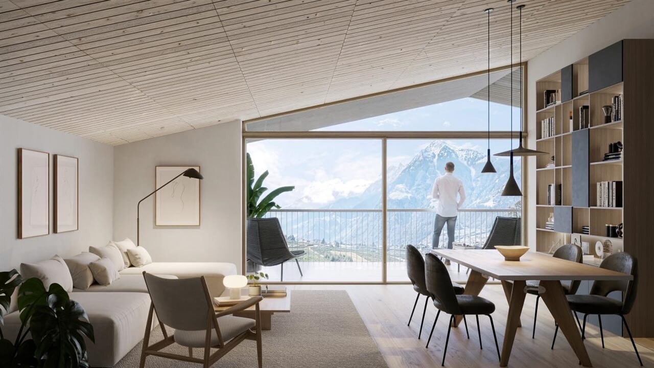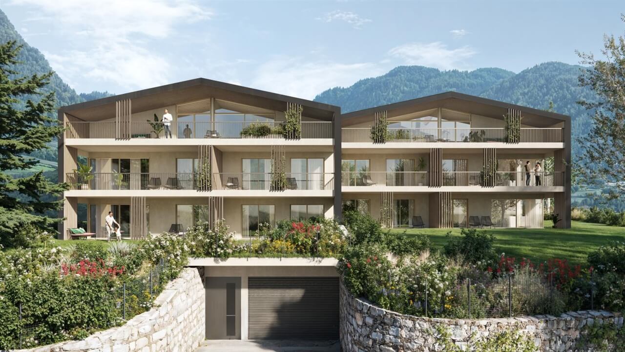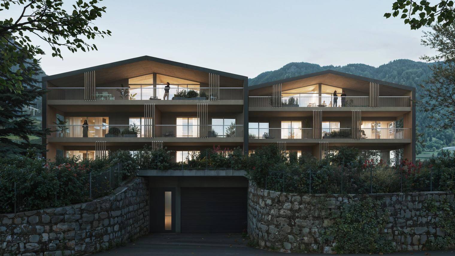 Die Wohnanlage entsteht etwas oberhalb der Straße, wodurch in jedem Stockwerk eine Aussicht auf die umliegende Berglandschaft gegeben ist. Gleichzeitig sorgt die Ausrichtung des Grundstücks für großzügige Privatgärten und eine offene, helle Wohnatmosphäre.