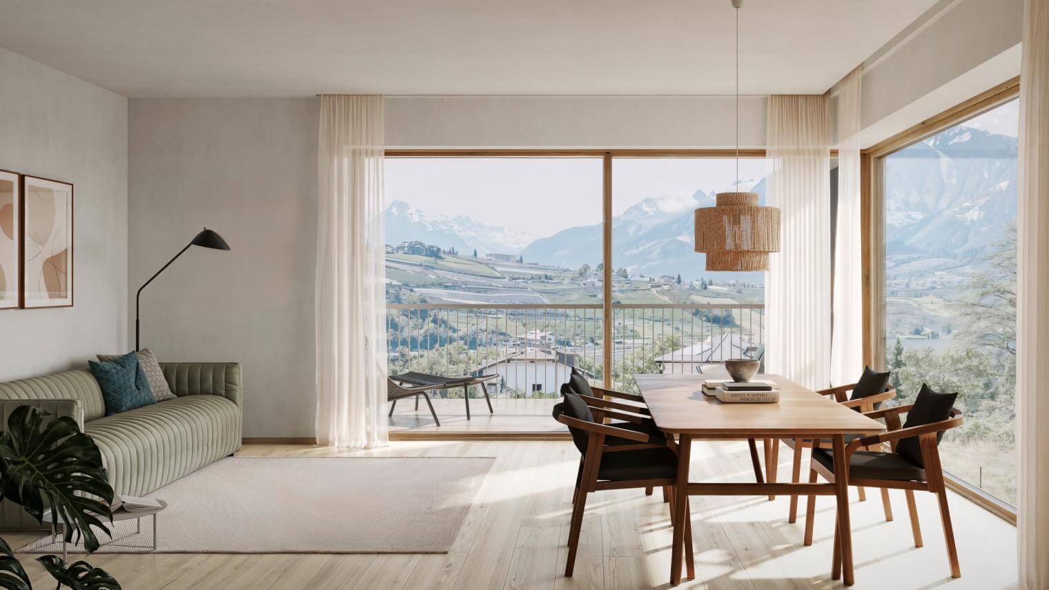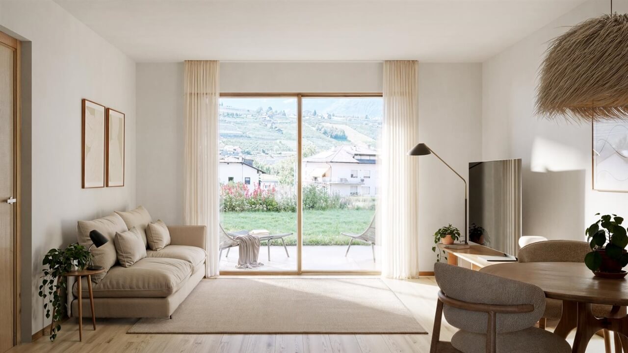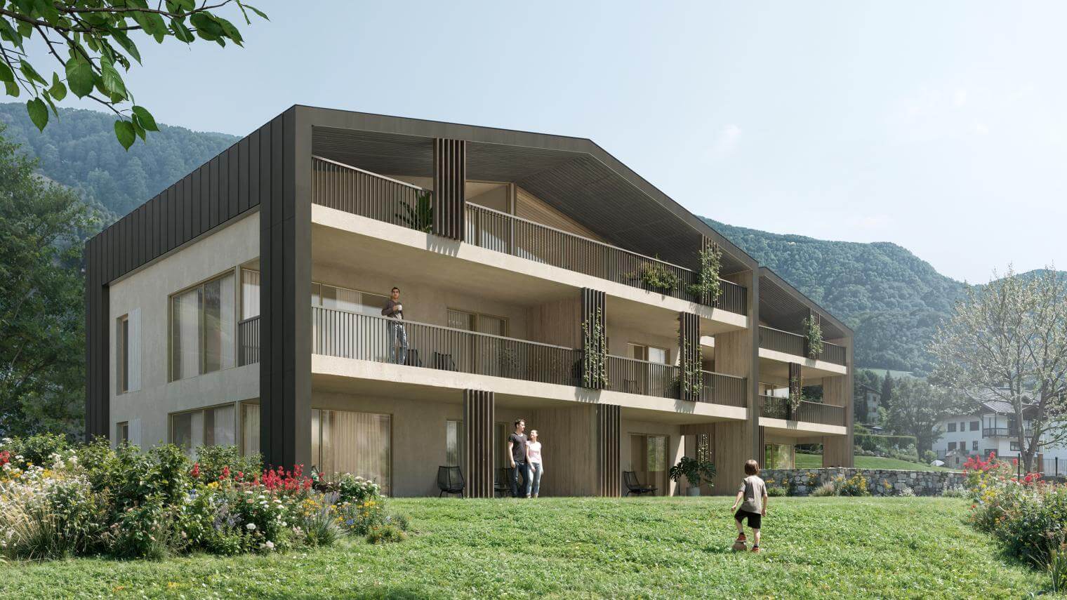 Die Wohnanlage entsteht etwas oberhalb der Straße, wodurch in jedem Stockwerk eine Aussicht auf die umliegende Berglandschaft gegeben ist. Gleichzeitig sorgt die Ausrichtung des Grundstücks für großzügige Privatgärten und eine offene, helle Wohnatmosphäre.